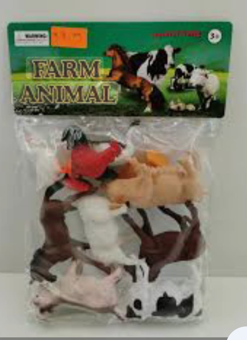 El set incluye 8 figuras de animales de granja como caballo, vaca, cerdo, oveja, cabra, pato, ganso y gallo. Algunos sets también pueden incluir búfalo, burro o perro.