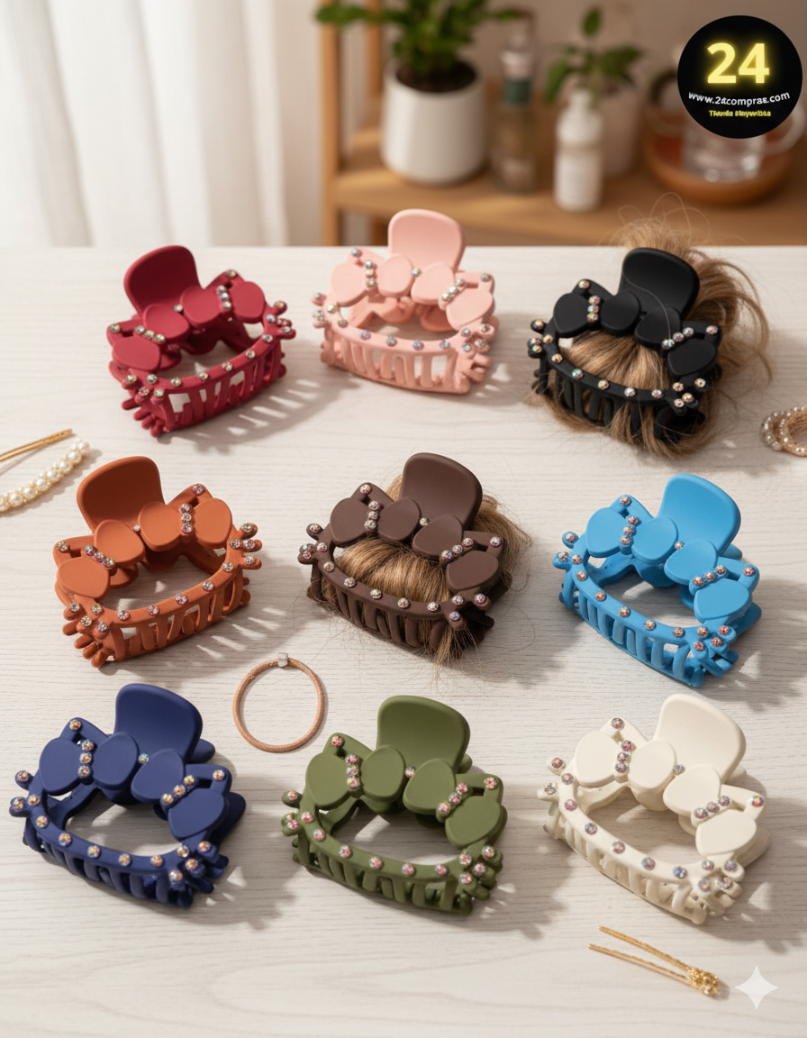 Las pinzas para el cabello con diseño de moño y pedrería son el accesorio ideal para darle un toque de brillo y estilo a tu peinado. Están elaboradas en plástico resistente con acabado mate, adornadas con piedras brillantes que reflejan la luz de manera encantadora.