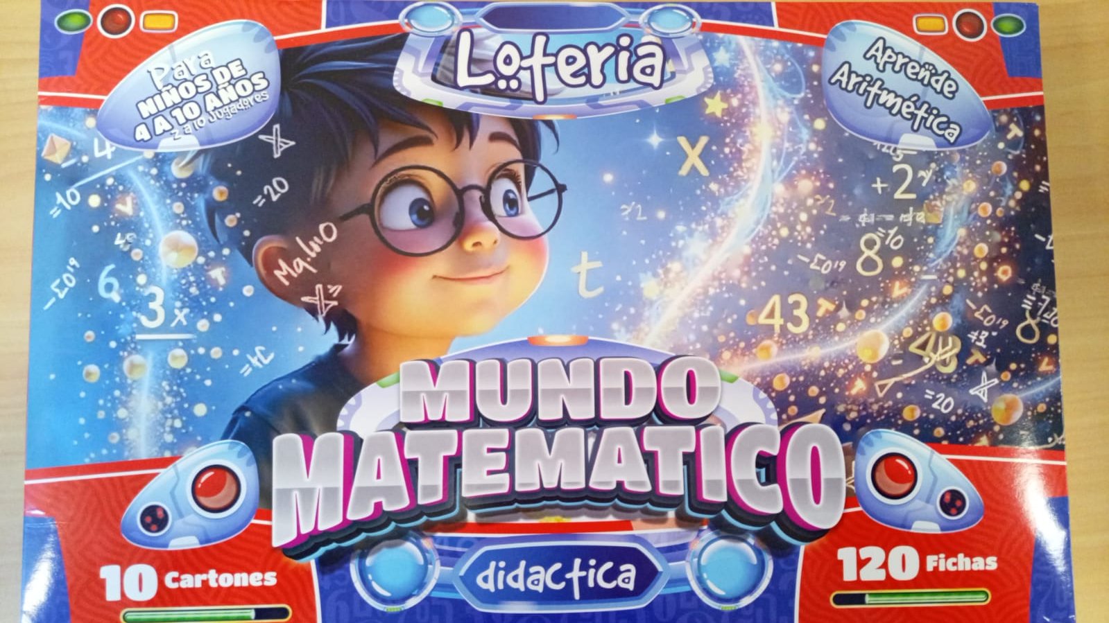 La caja, con un diseño dinámico y futurista, presenta a un niño con gafas que mira al espacio, rodeado de estrellas y fórmulas matemáticas. Esto sugiere que el juego llevará a los niños a un viaje cósmico de números y operaciones.