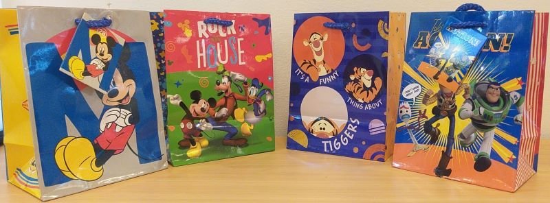 Bolsas de regalo decoradas con una multitud de divertidos personajes animados.