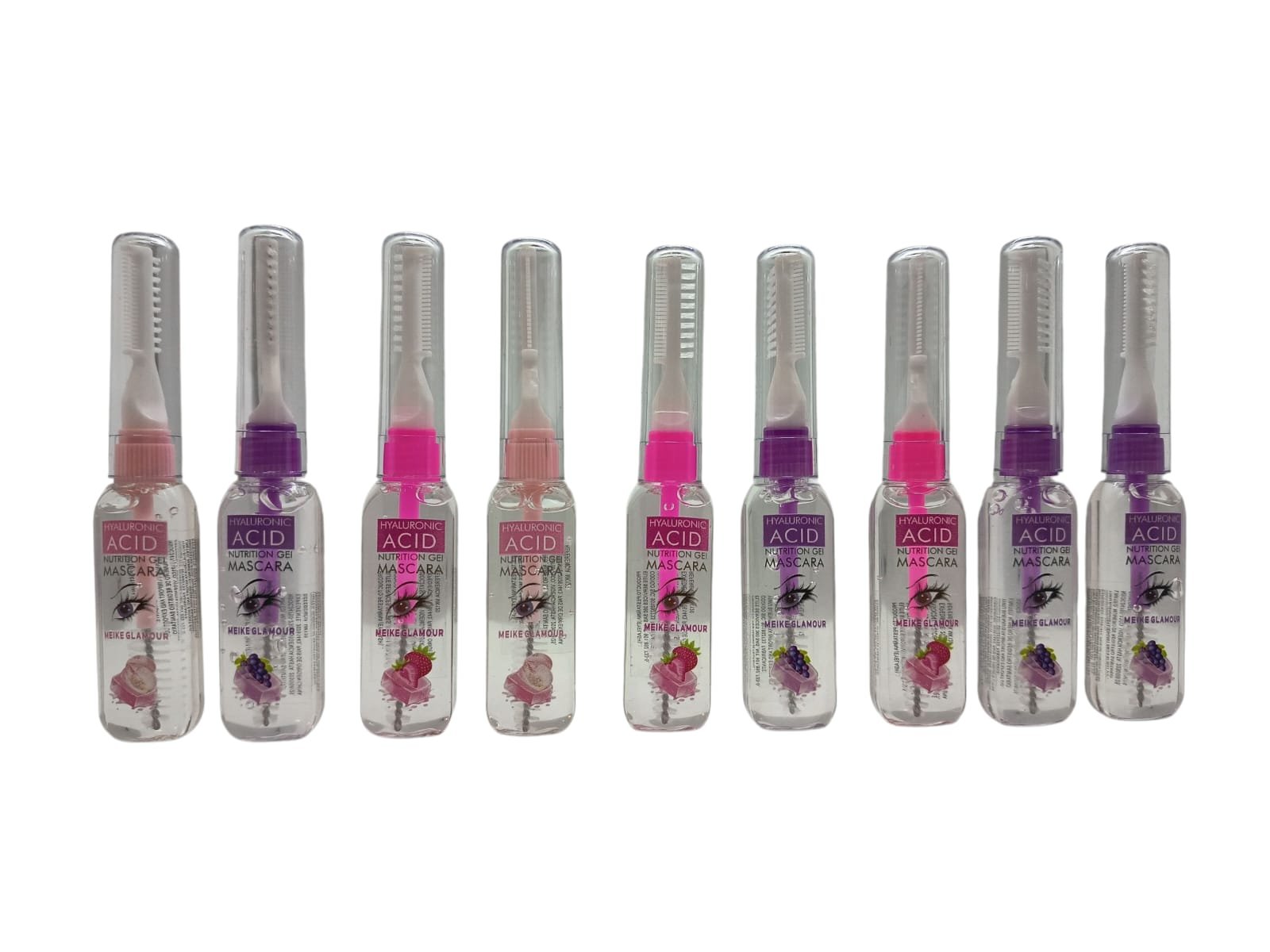 • El envase es transparente con detalles en colores como morado y rosa, y tiene un aplicador de cepillo.