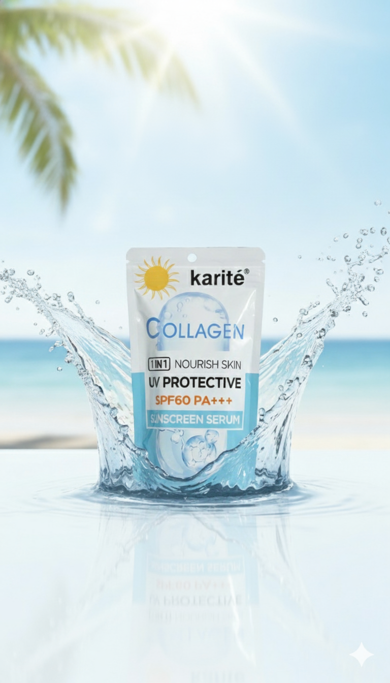 ¡Protección y Juventud en un solo paso! El Karité Collagen Sunscreen Serum SPF 60 PA+++ es la solución 4 en 1 que tu piel necesita. Combina un alto factor de protección solar (SPF 60) con el poder nutritivo del Colágeno, ayudando a prevenir el envejecimiento prematuro mientras mantiene tu piel hidratada y radiante. ¡Un serum ligero para una protección superior y un cuidado completo!