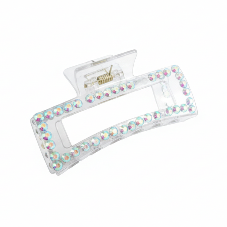 Descubre el accesorio perfecto que combina sofisticación y modernidad. Este broche de cabello, fabricado en un acrílico cristalino de alta calidad, está adornado con una hilera de cristales iridiscentes que capturan y reflejan la luz con cada movimiento, creando un efecto deslumbrante y multifacético.