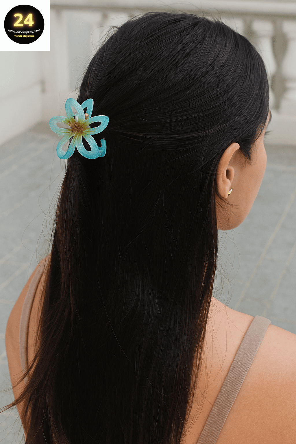 El diseño es bicolor, con un tono principal en los pétalos y un color secundario, más oscuro, en el centro, creando un efecto degradado o de veteado. La colección incluye varias pinzas en distintos colores como azul/verde azulado, rosa, amarillo y rojo, lo que las convierte en un accesorio versátil y llamativo para adornar cualquier peinado..