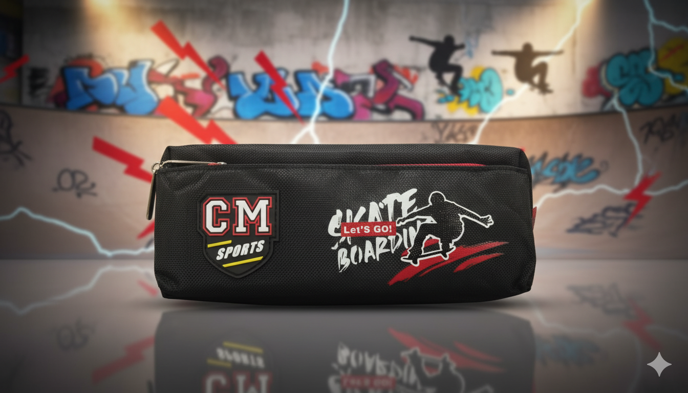 Este estuche escolar/cartuchera de estilo deportivo es ideal para llevar y organizar tus lápices, bolígrafos y útiles escolares con un toque moderno y lleno de energía. Su diseño se inspira en el skateboarding, presentando gráficos audaces y un fondo que evoca un skatepark.
