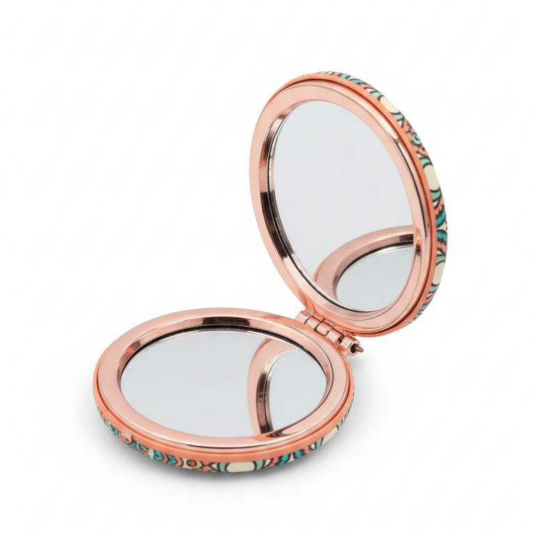 Descripción: Este elegante espejo compacto es el accesorio perfecto para llevar en tu bolso o bolsillo. Con su atractivo y detallado diseño de mandala, no solo es una herramienta funcional, sino también una pieza de arte portátil. Su formato de doble espejo lo hace ideal para cualquier situación, desde retoques rápidos hasta aplicaciones de maquillaje más precisas.