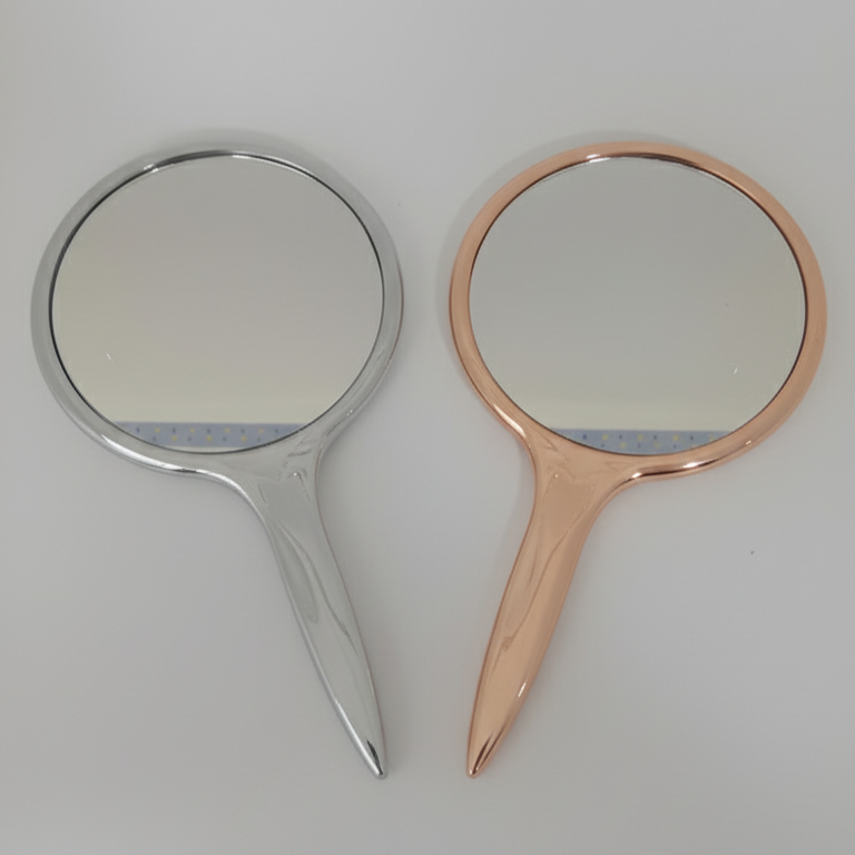 Captura cada detalle con nuestros espejos de mano, la herramienta perfecta para una aplicación de maquillaje impecable o un retoque rápido. Elige entre el acabado plateado clásico y el brillante oro rosado para complementar tu estilo. Su diseño ligero y ergonómico te permite sujetarlos con comodidad, y su doble espejo te ofrece versatilidad para cualquier ocasión. Son tan elegantes como funcionales, el accesorio imprescindible para cualquier neceser.