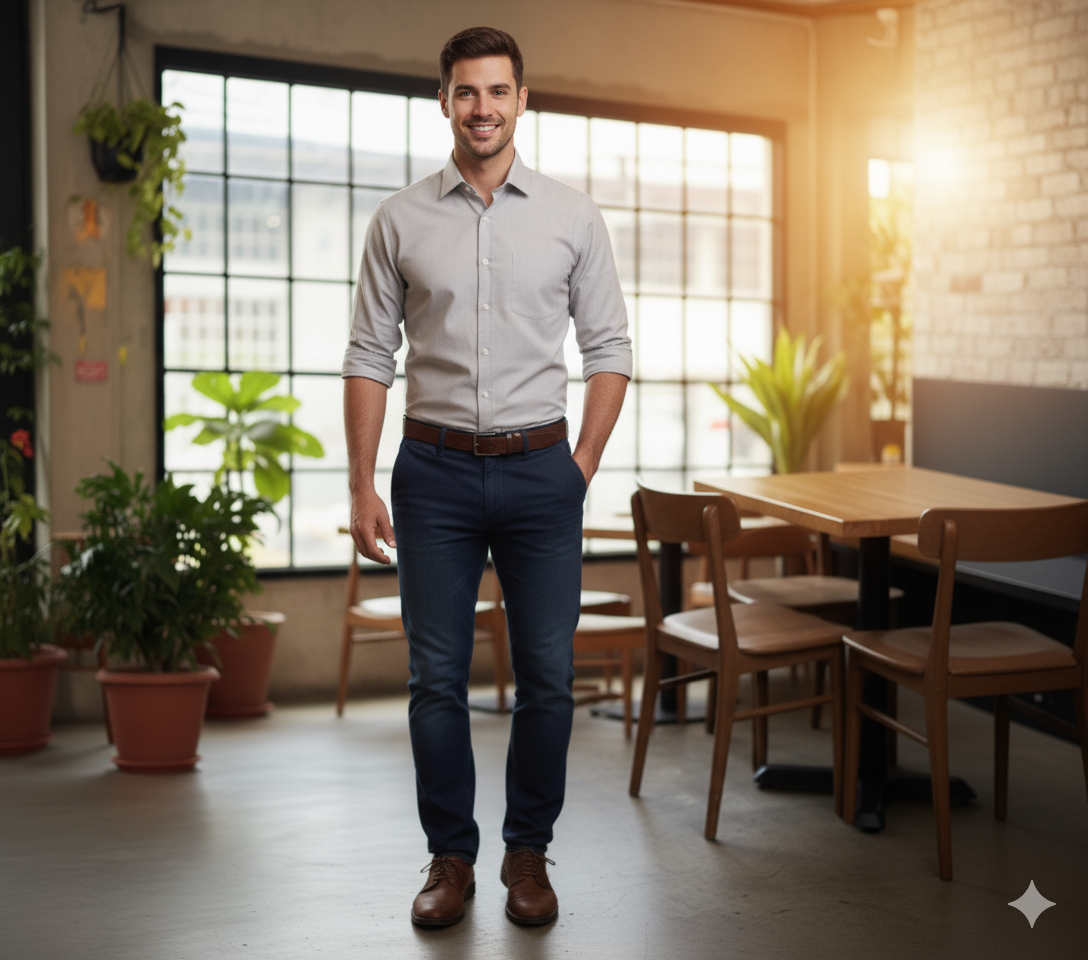 Diseño: Presenta un cuello clásico o francés (no abotonado), puños abotonados y un bolsillo de parche discreto en el pecho. El corte parece ser recto o ligeramente entallado.