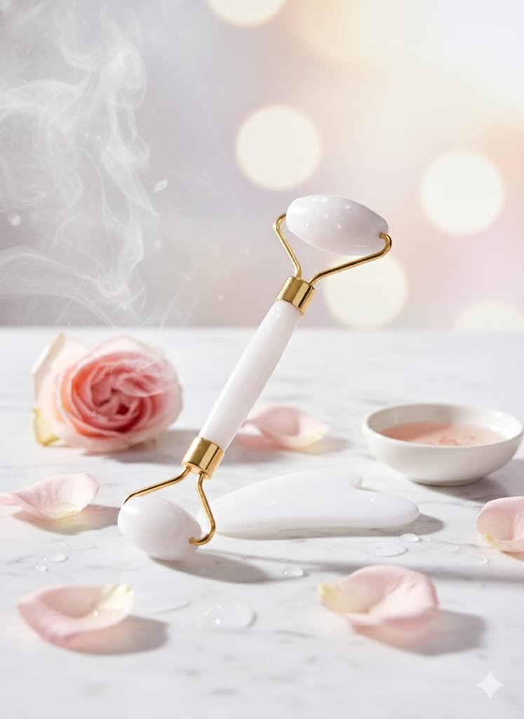 Este es un set de belleza facial que incluye un rodillo de masaje y una herramienta Gua Sha, ambos de un elegante color blanco/cuarzo lechoso con detalles de metal en tono dorado.